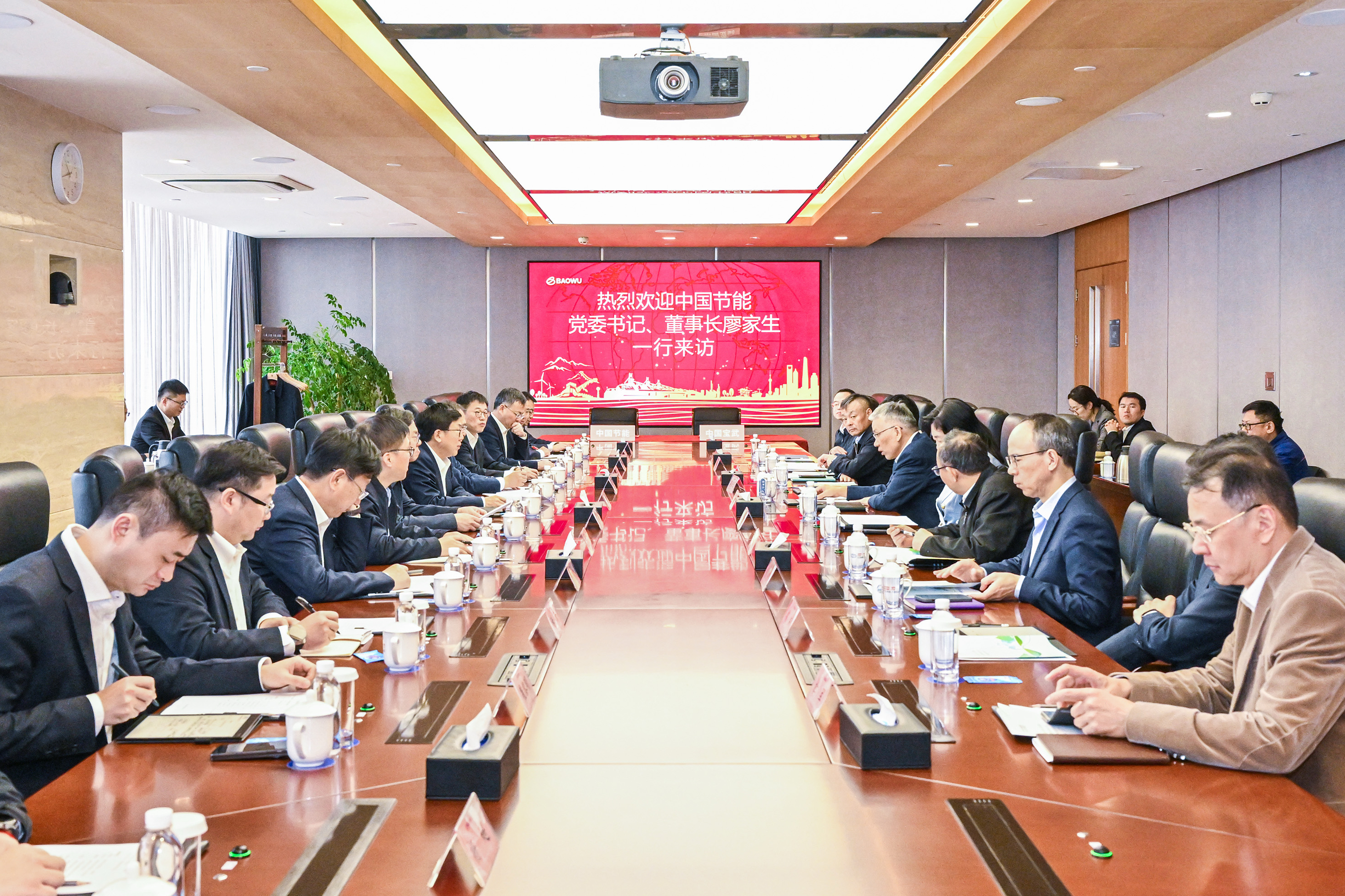 侯安貴對廖家生一行的到訪表示熱烈歡迎,并介紹了中國寶武的發展歷程和業務體系。他指出,作為全球最大鋼鐵企業之一,中國寶武以“共建鋼鐵生態圈,共創綠色新未來”為使命,始終將綠色低碳轉型作為實現高質量發展的必由之路,與中國節能既有很好的合作基礎,也有很大的合作空間。中國寶武期待將產業場景優勢與中國節能的專業技術優勢深度融合,在智慧水務、固廢資源化、鋼鐵余熱利用、綠電直連、碳認證碳交易、綠色賬戶建設等方面進一步加強合作,攜手打造央企間協同發展和綠色轉型的典范。 集團總經濟師兼大數據公司黨委書記、董事長鄭朝暉,集團董事會秘書兼合作部主任趙友民,戰略部、節能科技公司、風電公司、中節能實業、中國啟源、中節能國禎等單位負責人;中國寶武資源與新材料業發展部、智慧服務業發展部、戰略規劃部、寶武環科、寶武水務、寶地資產、寶武清能、歐冶云商、中鋼國際等單位負責人參加上述活動。