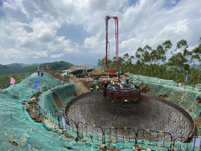 8月18日,經過16個小時的緊張施工,風電廣西公司來賓忻城宿鄧低風速試驗風電場首臺風機基礎順利完成澆筑。