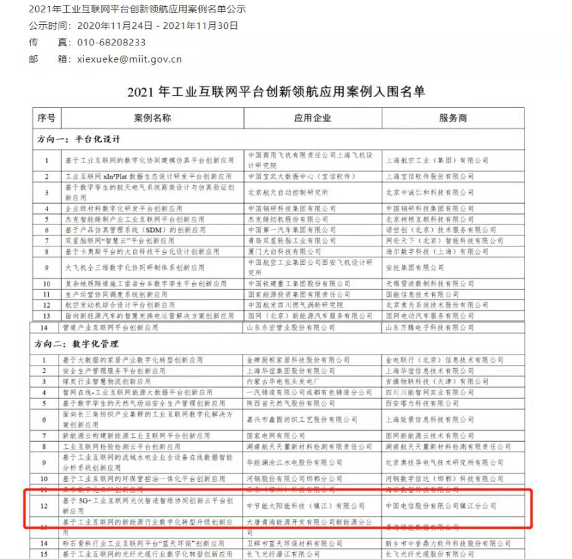 太陽能鎮江公司上榜工信部工業互聯網平臺 創新領航應用案例 |