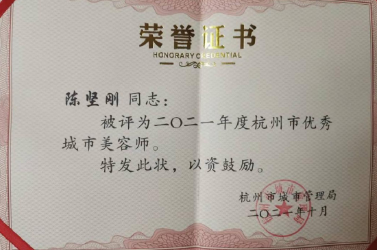 中國環保杭州公司陳堅剛獲得杭州市優秀城市美容師稱號 |