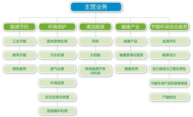 中國節能主業涉及節能、環保、健康、清潔能源及節能環保綜合服務(包括相關監測評價、規劃咨詢、設計建造、工程總承包、運營服務、技術研發、裝備制造和產融結合)。目前,中國節能在工業節能、建筑節能、固廢處理、污水處理、煙氣治理、環境監測、土壤修復、重金屬治理、風電、太陽能、新材料、健康產業等多項細分業務領域,規模和實力國內領先。