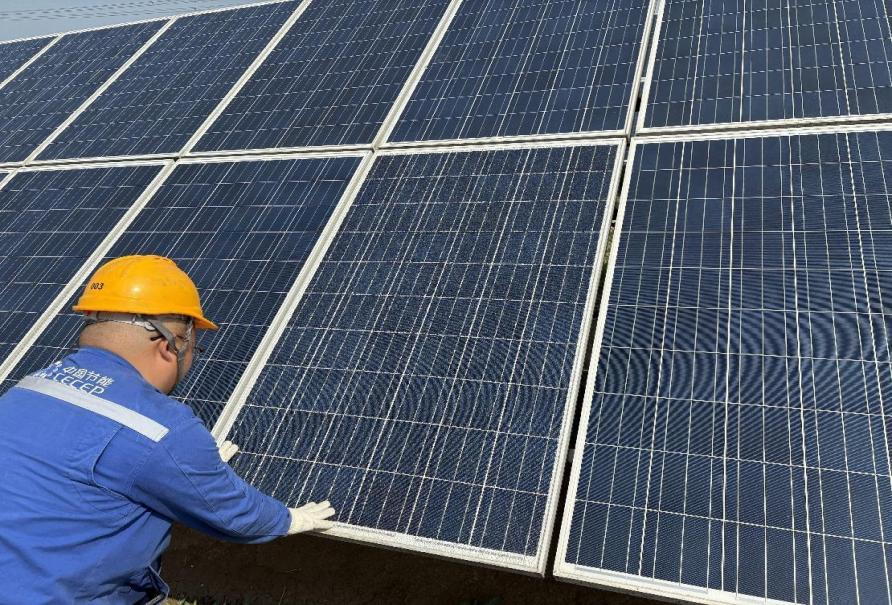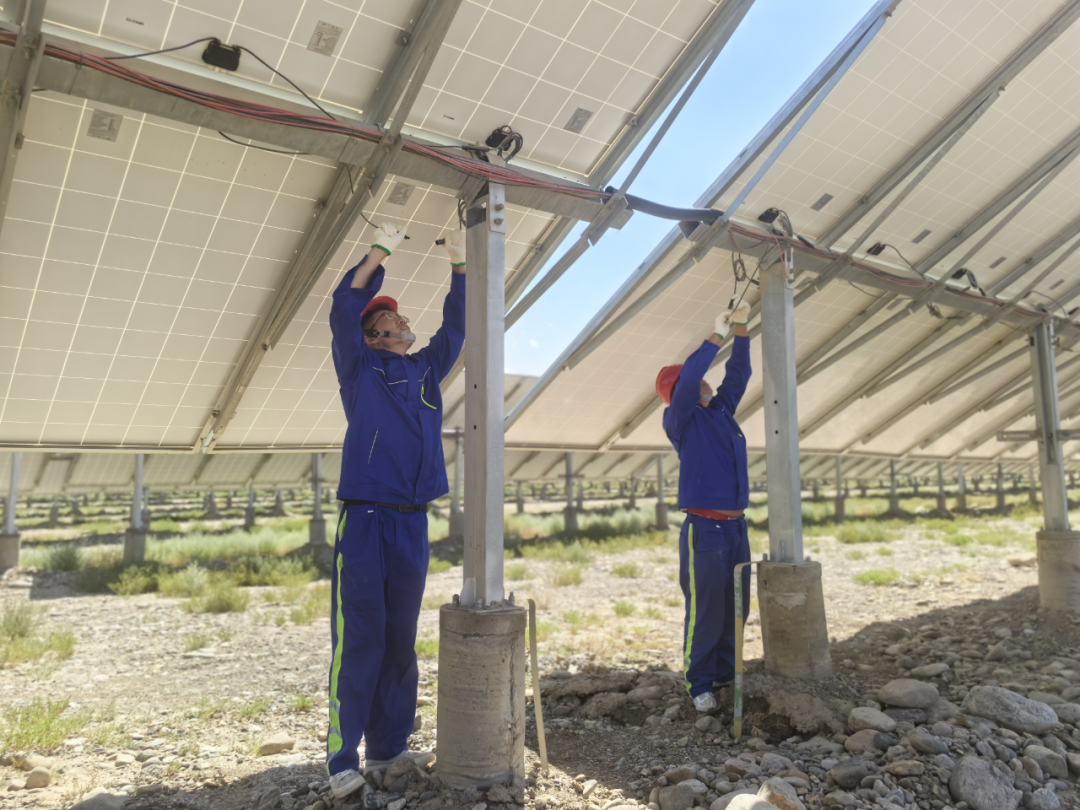 太陽能肅州電站運維人員正在調節光伏支架角度