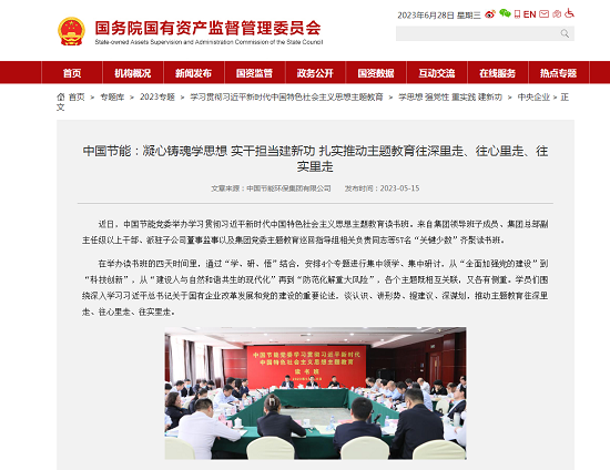 隨著主題教育的深入開展,中國節能將持續精準發力,把理論學習、調查研究、推動發展、檢視整改等貫通起來、一體推進,扎實做好學習貫徹習近平新時代中國特色社會主義思想的深化、內化、轉化工作,以實干實績交出高質量發展的生動答卷。
