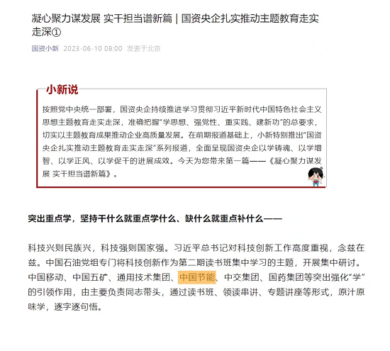 ?近日,中央主題教育官網、國資委網站、“國資小新”新媒體平臺、國資委主題教育簡報多篇次、高頻次報道中國節能開展主題教育的特色亮點和經驗做法,《習近平經濟思想研究》期刊特別刊發中國節能黨委書記、董事長宋鑫有關充分發揮主題教育牽引力作用,推動長江經濟帶高質量發展的署名文章,對中國節能扎實推動主題教育走深走實的具體實踐給予高度評價。